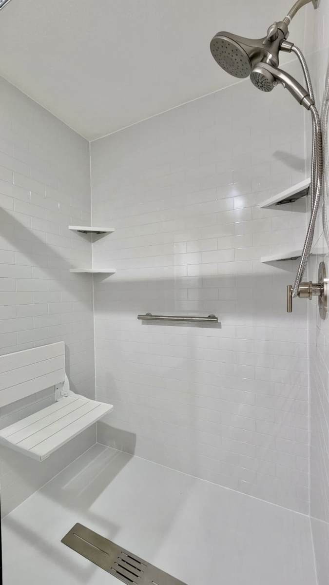 At Bath Expo Cleveland, we recently completed a standout full bathroom renovation in Avon Lake, OH, designed to align the Dunn family’s home with their evolving lifestyle needs. Located in a quiet neighborhood just minutes from the lake, this project addressed the homeowners’ desire to replace a sprawling, unused tub and a cramped shower with a spacious 60 x 48 walk-in shower with a white shower base, brushed nickel Moen fixtures, multiple built-in shelves, grab bars, and a clear glass Franklin shower enclosure. The project also included luxury vinyl plank flooring in both the master and upstairs bathrooms, a 72-inch white double vanity with white quartz countertops, new mirrors, robe hooks and racks, a tower cabinet for added storage, and a replaced exhaust fan—creating a cohesive, modern, and highly functional space.